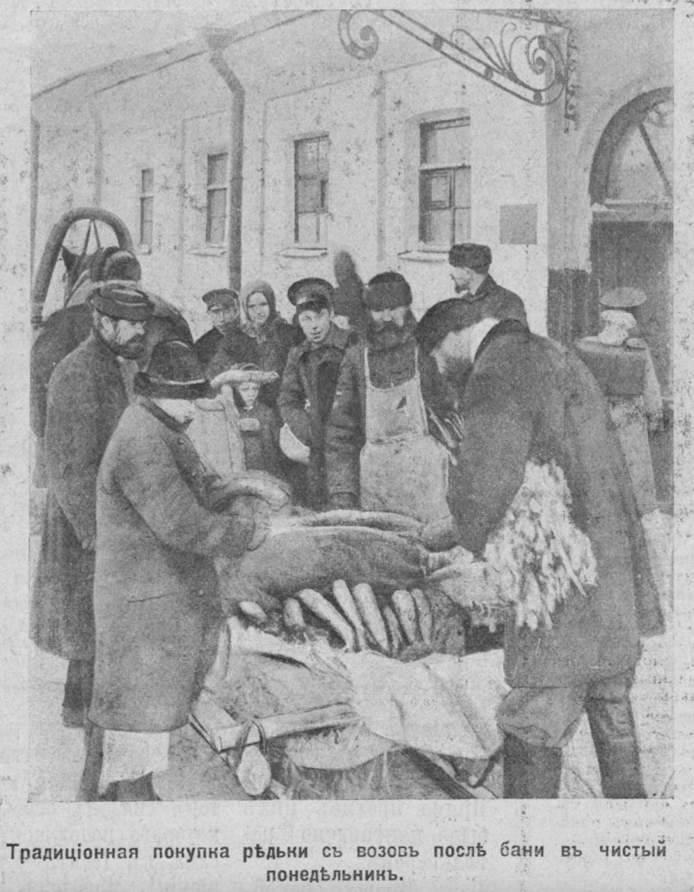 Понедельник первой недели великого поста назван «чистым», и среди купечества, мещанства и простонародья первая забота в этот день сходить в баню, выпарить остатки хмеля и чисто-начисто вымыть усталое от масленичной встряски тело. Вторая забота — купить редьки.