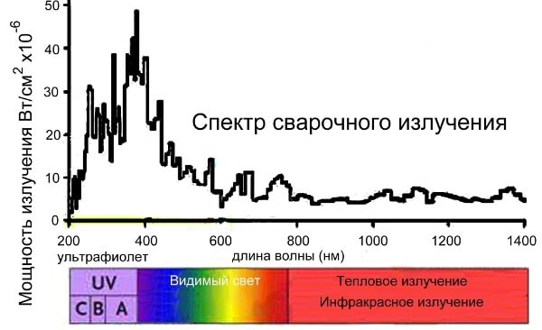 А ещё газ, разогретый до такой температуры, начинает ярко светиться. Причём если в спектре света, излучаемого относительно холодным Солнцем, 45 % приходится на видимый свет, ещё 45 % - на невидимое инфракрасное излучение, и лишь 10 % - на высокоэнергетические ультрафиолетовые и другие компоненты, то в свете горячей сварочной дуги на видимый свет приходится 15 %, ещё 15 % - на инфракрасные лучи, а 70 % - на ультрафиолет.