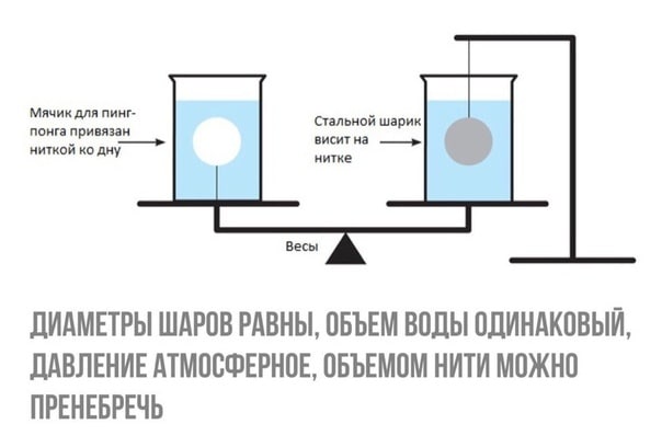 Итак, для начала важно понять, что сила, действующая на левую чашку весов (ту, в которой шарик для пинг-понга) строго равна сумме собственных весов стакана, воды в стакане и весу шарика, массой которого можно пренебречь по сравнению с массой воды и стакана. Нитки и всё остальное в задаче нужны лишь для отвлечения внимания: все они находятся внутри системы (стакана) и не могут повлиять на процесс взвешивания, который является внешним для этой системы. Позже мы покажем это более строго, а пока перейдём к стакану с тяжёлым шариком.