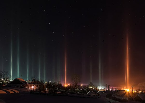 Мы уже затрагивали тему оптических эффектов, возникающих при прохождение света через облака, состоящие из крошечных льдинок (например, тут и тут), но теперь рассмотрим эту тему более подробно. И начнём с одного из самых красочных, но в то же время самых простых с физической точки зрения эффектов - т.н. световых столбов.