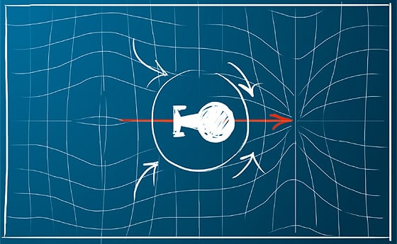 На картинке - примерный вид искривлённого пространства впереди и позади корабля, находящегося внутри объёма нормального пространства - т.н. пузыря Алькубьерре.