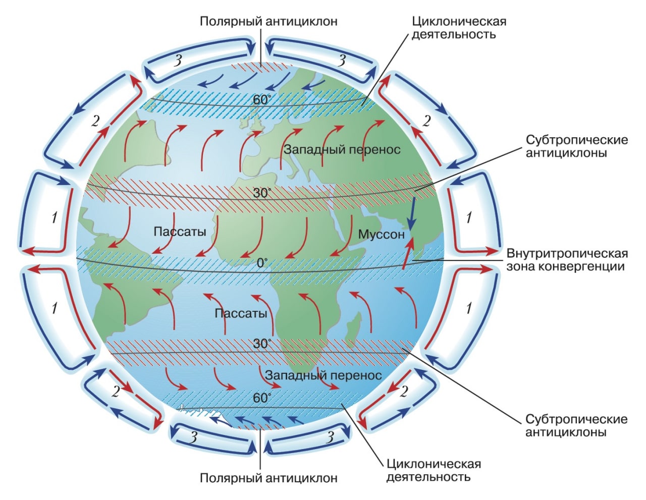 Наличие больших массивов суши с горами, лесами, водоёмами и прочим сильно влияет на атмосферную циркуляцию, создавая локальные ветровые потоки. В наиболее чистом виде она проявлена в средних широтах южного полушария, большую часть которых занимает океан. Знаменитые "ревущие сороковые" (зона постоянных сильных западных ветров в районе 40 градусов южной широты) - это как раз оно самое.