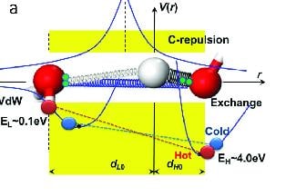 Картинка ниже – иллюстрация из оригинальной статьи Зи Чанга. Белый шарик в центре – атом кислорода. Справа – атом водорода «своей» молекулы воды, соединённый с ним короткой пружинкой сильной ковалентной связи. Слева – атом водорода «чужой» молекулы воды, связанный с данным атомом кислорода длинной пружинкой слабой водородной связи.