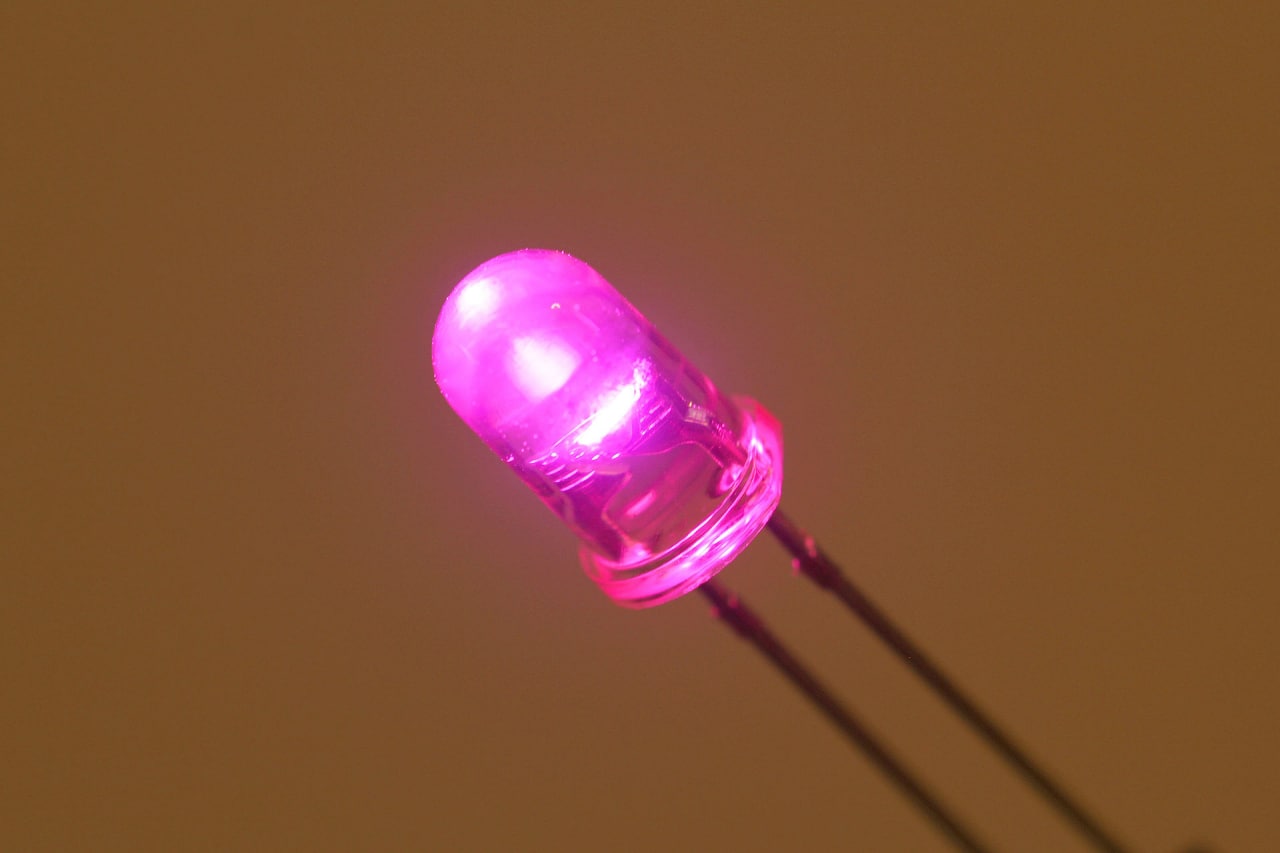 На картинке – розовый светодиод: его свет состоит из синего свечения, собственно, диода и красного свечения люминофора, которым покрыт корпус лампы.