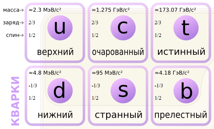 На картинке - все шесть известных в настоящее время кварков, протоны и нейтроны состоят из комбинаций по три кварка u- и d- типов.