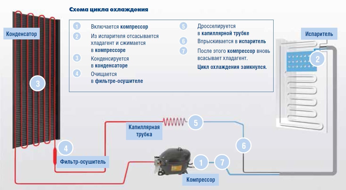 В целом холодильник состоит из трёх основных элементов: это представляющий собой сеть трубок испаритель, который размещён в основной камере холодильника, конденсатор (тоже сеть трубок, но меньшего объёма), находящийся снаружи на задней стенке холодильника, а также компрессор, соединяющий обе эти системы. Четвёртый элемент, позволяющий конструкции работать – хладагент, специальное вещество, которое циркулирует внутри системы, осуществляя теплообмен между её частями и окружающей средой.