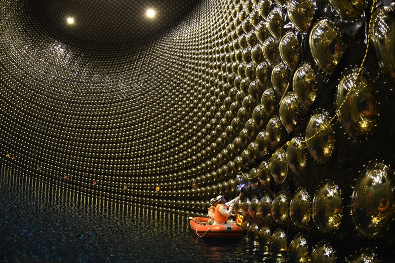 Проблема в том, что улавливать нейтрино довольно сложно именно из-за их слабого взаимодействия с веществом. Для этого учёные идут на разные ухищрения и строят весьма внушительного вида установки - вроде детектора «Супер-Камиоканде» (фото изнутри него я прикрепляю в качестве иллюстрации) в Японии или Байкальского подводного нейтринного телескопа в России.