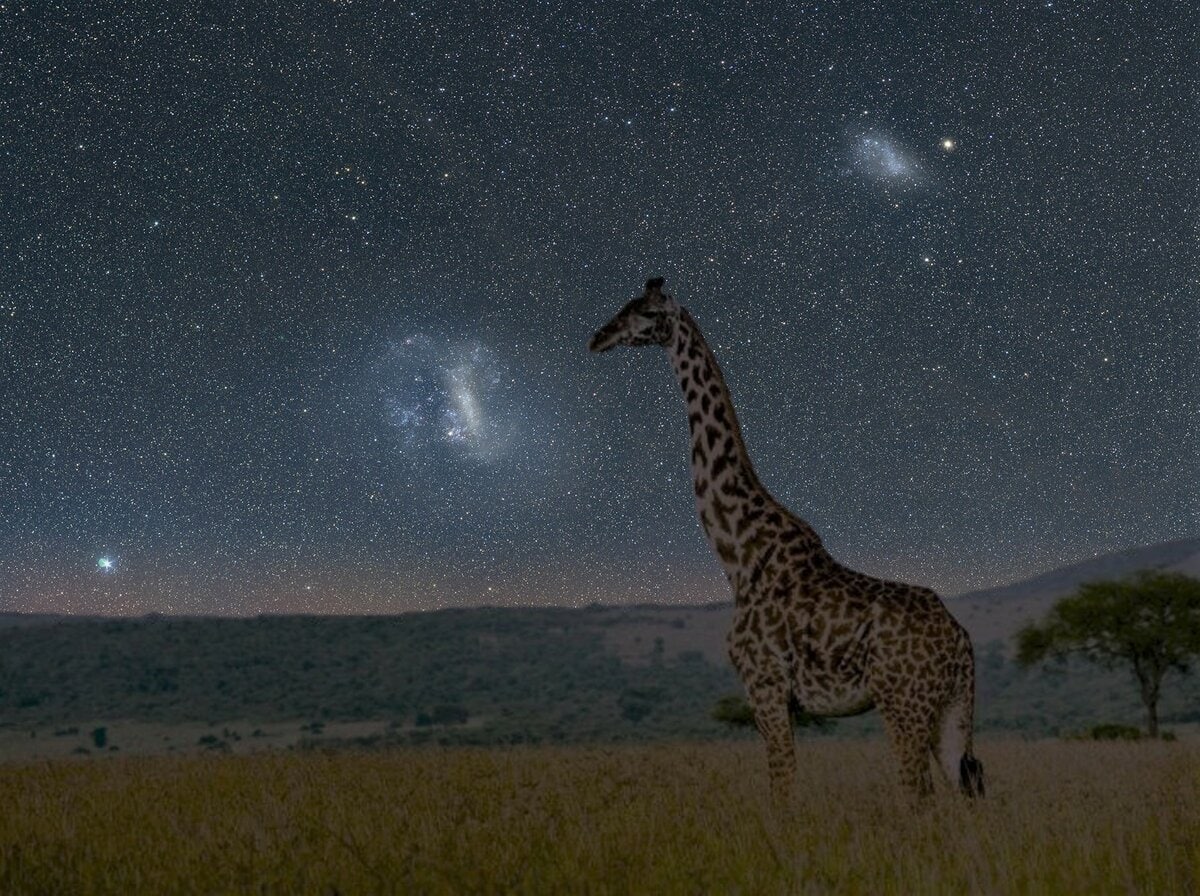 На фото - ближайшие к нам карликовые галактики, Большое и Малое Магеллановы облака. Они видны невооружённым глазом в Южном полушарии. В наших же широтах они, увы, скрыты за горизонтом круглой Земли.