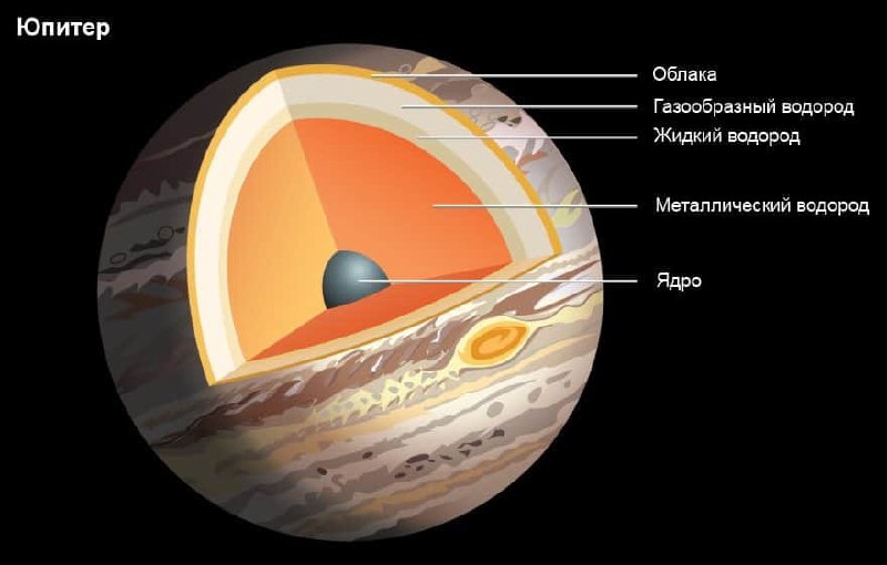 Ещё глубже давления внутри Юпитера таковы, что водород переходит в твёрдое состояние – т.н. металлического водорода.