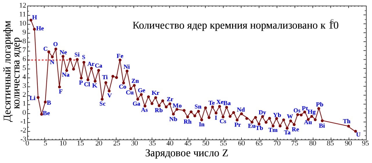 На картинке - сравнение распространённости химических элементов во Вселенной.