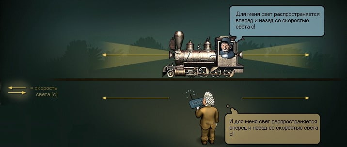 Но со светом это не так. Если мы будем светить фонариком из того же автомобиля (или, скажем, с борта летящего с огромной скоростью космического корабля), скорость испущенного этим фонариком света никак не будет зависеть от нашей собственной скорости и всегда будет одинаковой (примерно 300 тысяч километров в секунду).