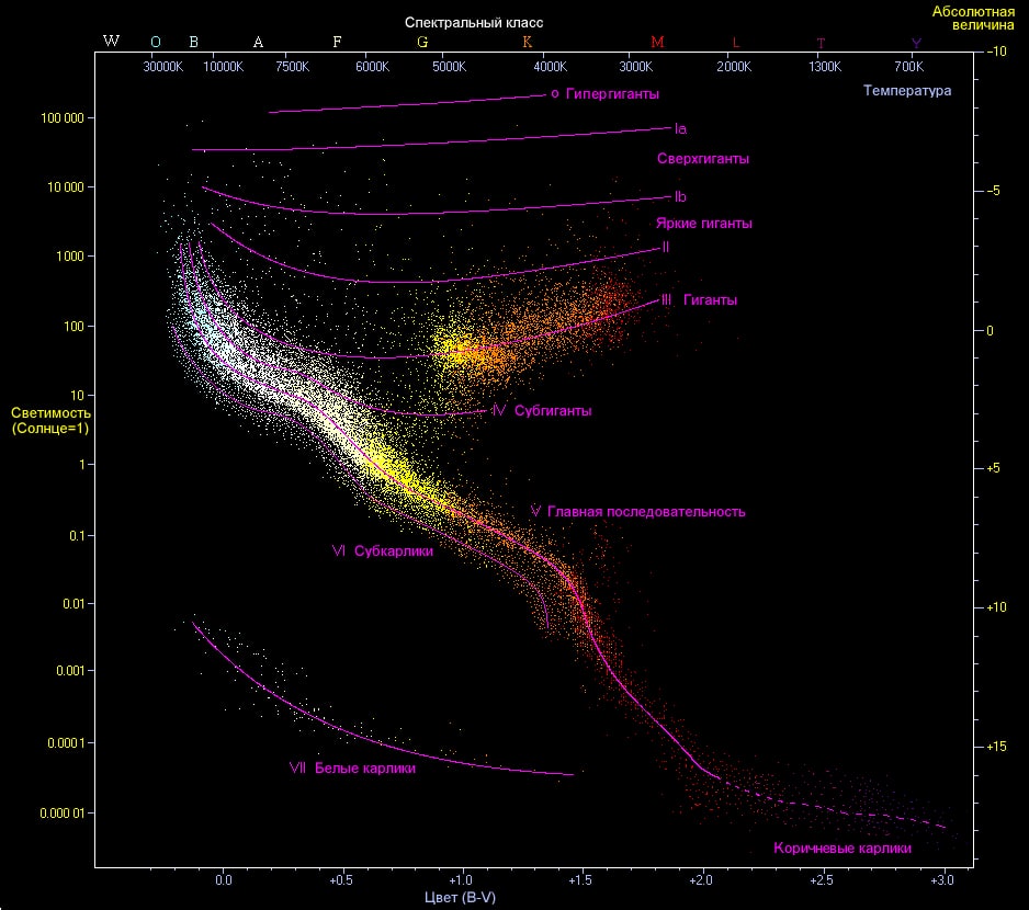 Диаграма Герцшпрунга-Рассела - своеобразный путеводитель по миру звёзд. По горизонтальной оси на ней отложен цвет звёзд (от голубых через белые и жёлтые к оранжевым и красным), по вертикальной - их светимость, которая, в свою очередь, определяется их размером (чем больше звезда, тем больше света излучается с её поверхности).