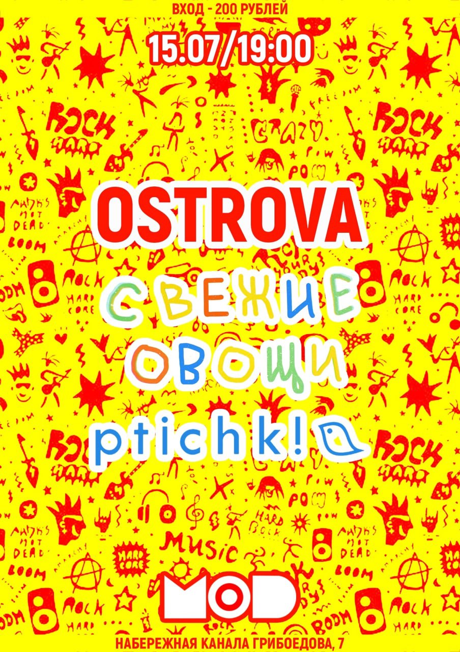 На экваторе лета клуб MOD приглашает всех на OSTROVA, Свежие Овощи и ptichk! И это не приглашение на пикник или в поход, а глоток свежего воздуха, бодрящей музыки и отличного настроения в самом центре раскалённого от зноя Петербурга.