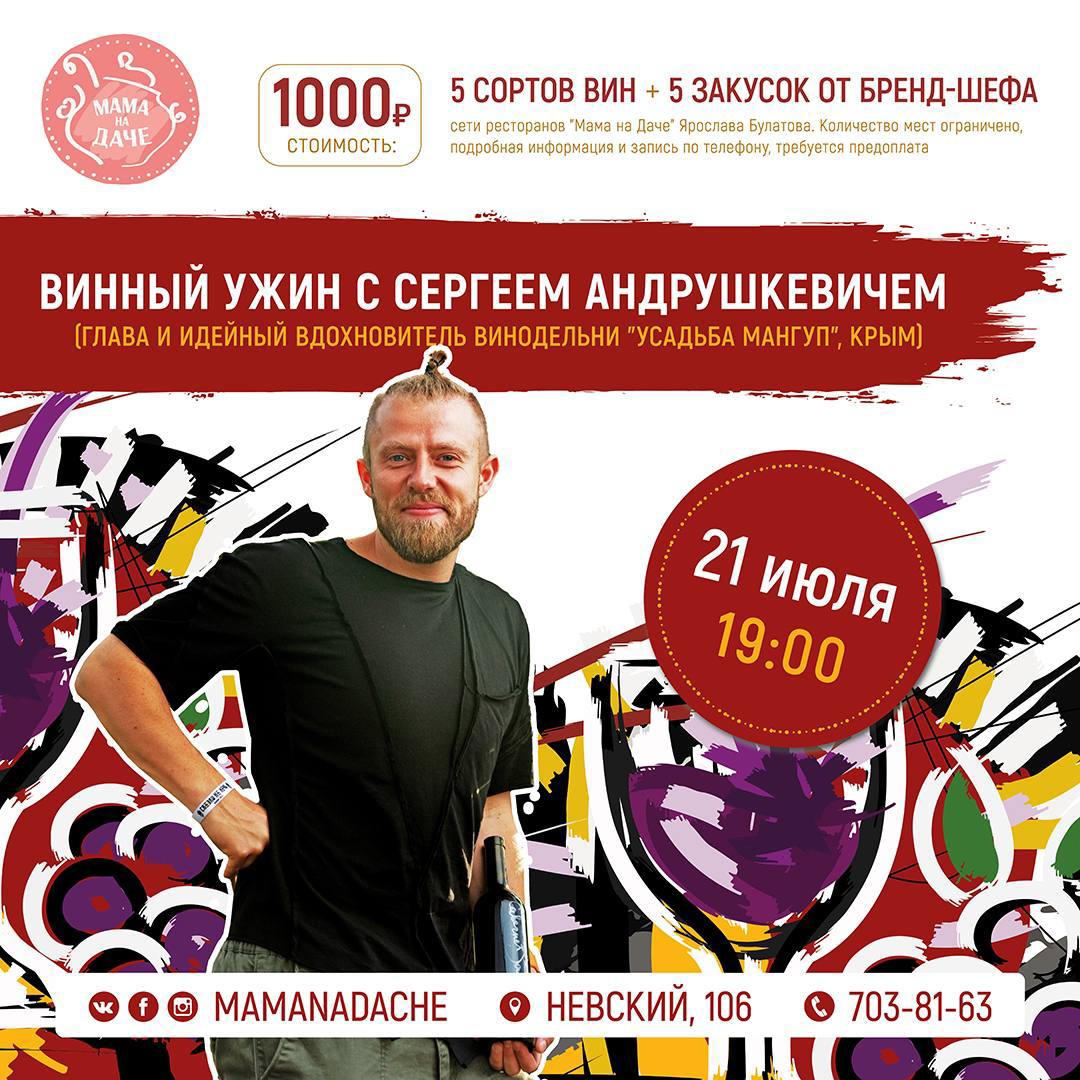 Ресторан «Мама на Даче» на Невском, 106 приглашает на винный ужин в компании Сергея Андрушкевича.