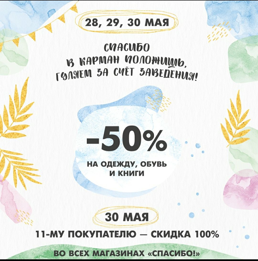 30 мая скидки на одежду, обувь и книги секонд-хенд 50% для всех.