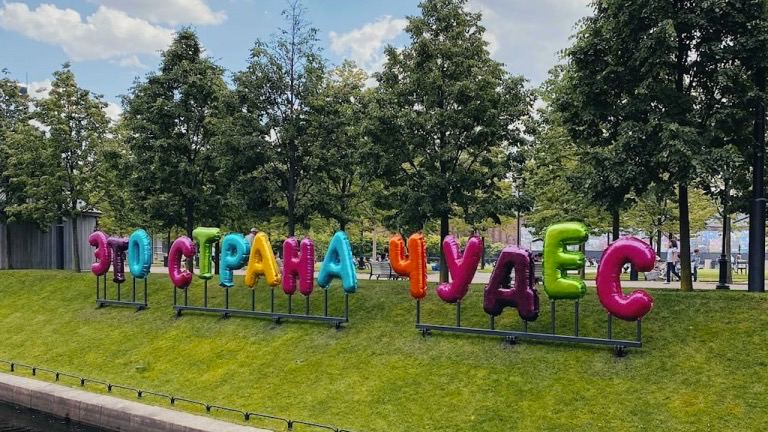 В год празднования десятилетия новой истории Новой Голландии художница Агата Манн создала на острове яркую объемную надпись, имитирующую буквы из надувных шаров. Праздничные шары — универсальные символы, часто сопровождающие знаковые и радостные события в нашей жизни.