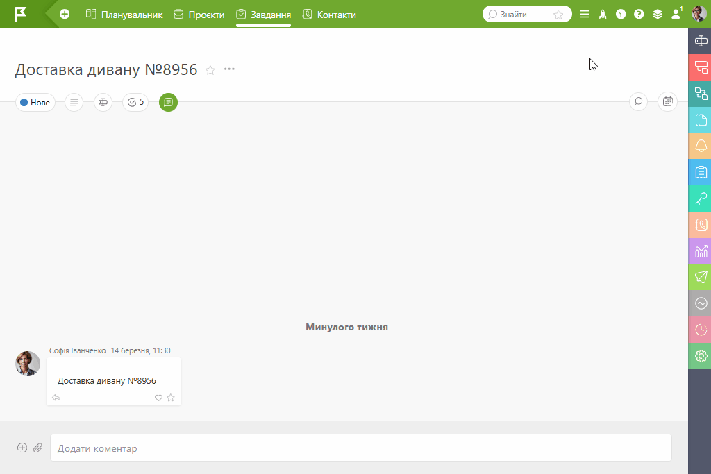 Верхній правий кут — новий дім для вкладки «Деталі». Саме туди перемістилися «Група» та позначка «Архівна». Здається, дрібниця… але дихається легше! Сподіваємося, для вас цей апгрейд стане маленьким, але затишним бонусом до продуктивного дня у Planfix 💚