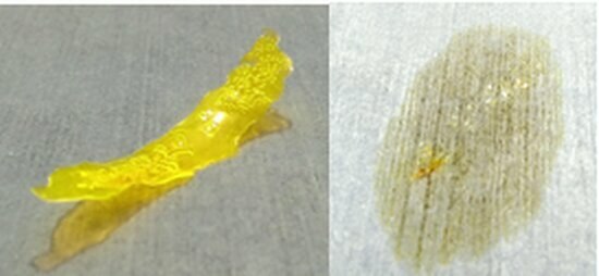 На фото: мокрое место (справа) — все, что осталось от образца саморазлагающегося полимера на свету ☀️☀️☀️