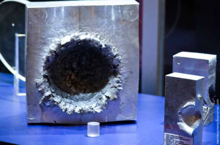 На фото: алюминиевый "панцирь" толщиной 102 мм, защищающий сверх критичные блоки международной станции, в который попал кусочек пластика (лежащий внизу) на скорости 6795 м/с.