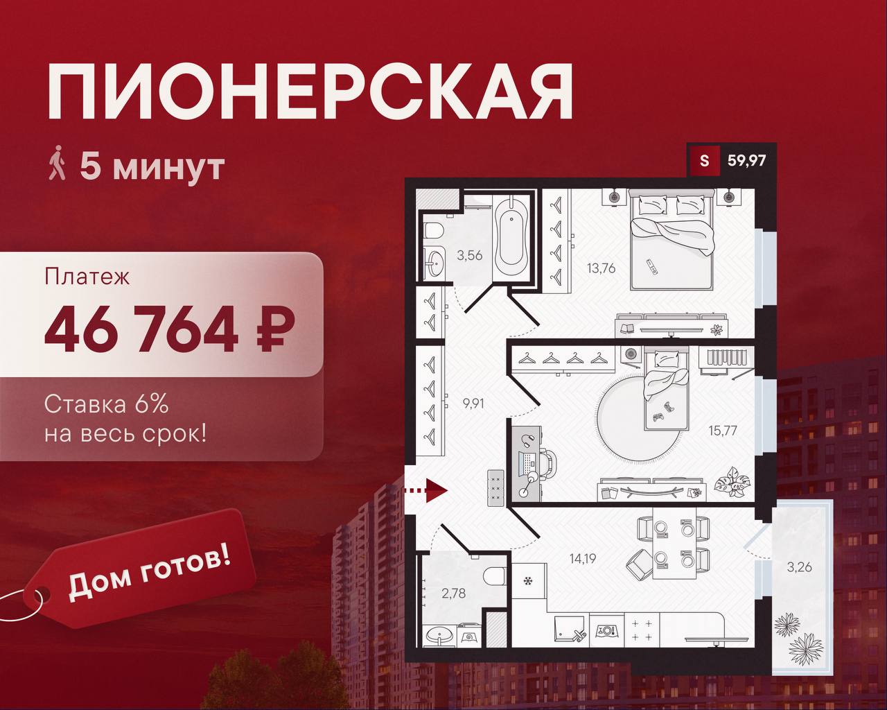 🔴 Платеж всего 46 764 ₽ — ненамного больше вашей текущей ипотеки за однушку, но уже 60 м² и две полноценные комнаты для семьи