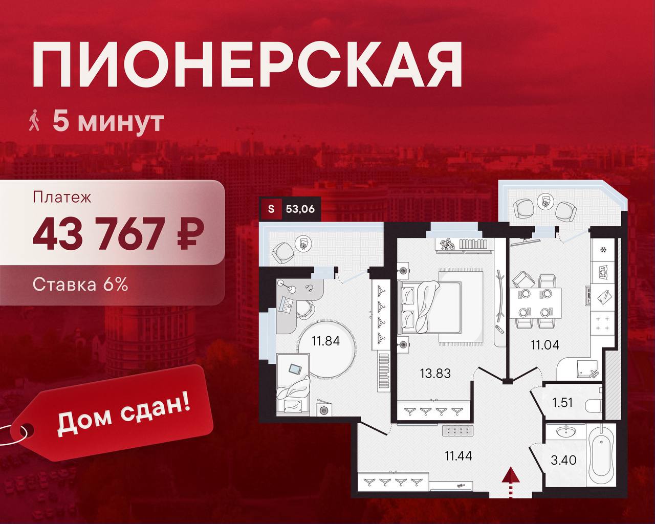 🔴 Двухкомнатная квартира в 5 минутах пешком от «Пионерской» за 46 764 ₽/мес