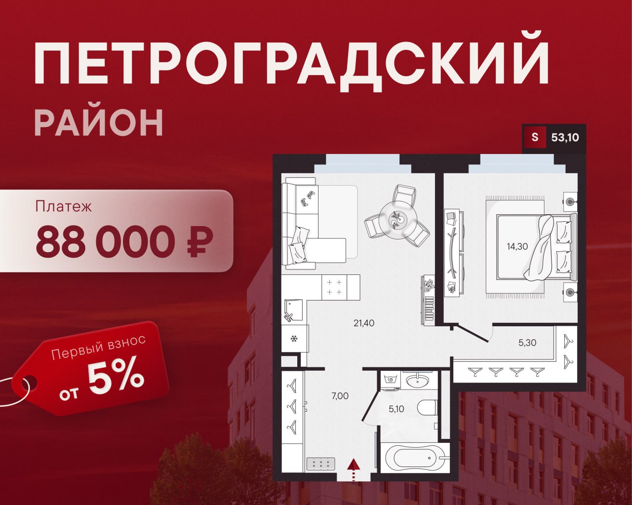 🔥 Первый взнос 5%: евродвушка на Петроградке за 88 000 ₽/мес