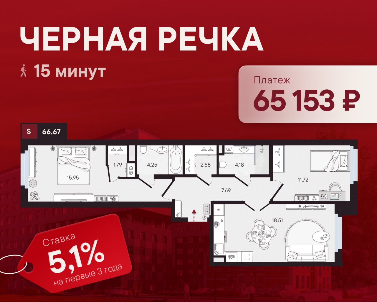 🔥 Ставка 5,1%: евротрешка в 15 минутах пешком от «Черной Речки» за 65 153 ₽/мес