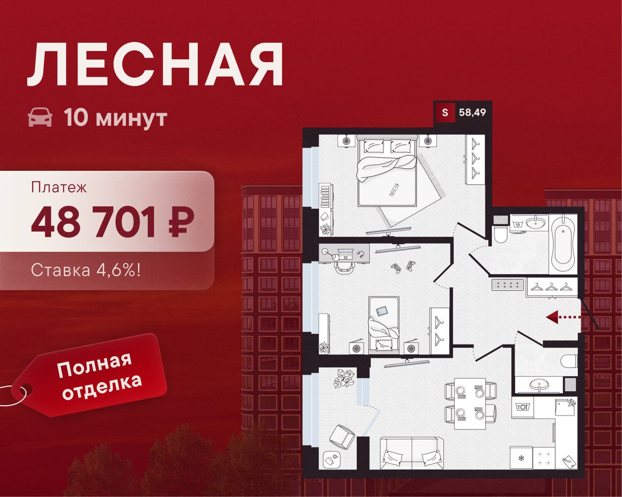 🔥 Евротрешка в 10 минутах от «Лесной» за 48 701 ₽/мес