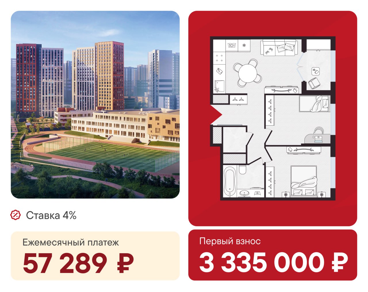 ❤️ Евротрешка в семейном квартале со ставкой 4% за 57 289 ₽/мес