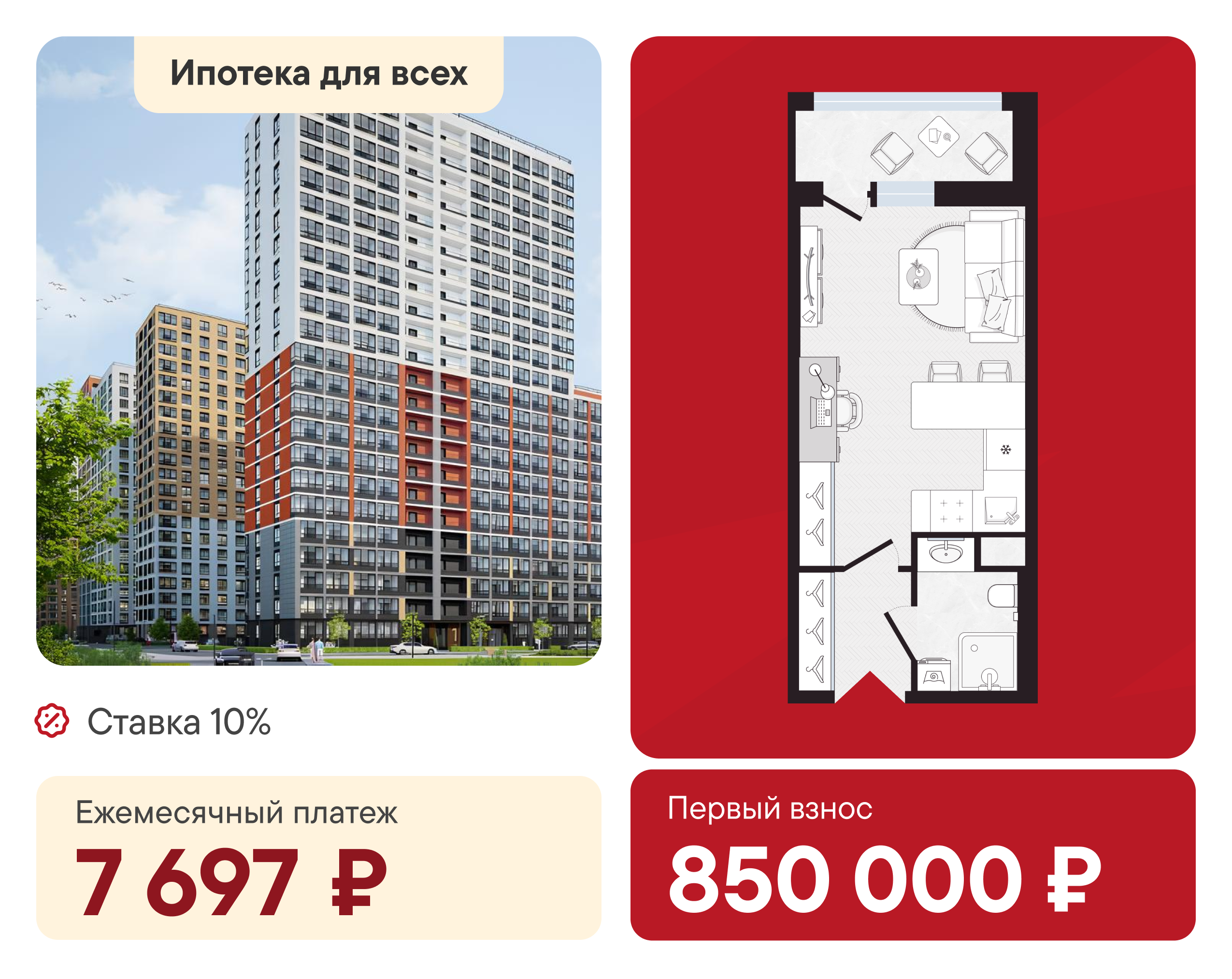 👍 Ипотека для всех: студия с первым взносом 850 000 ₽ и платежом 7 697 ₽