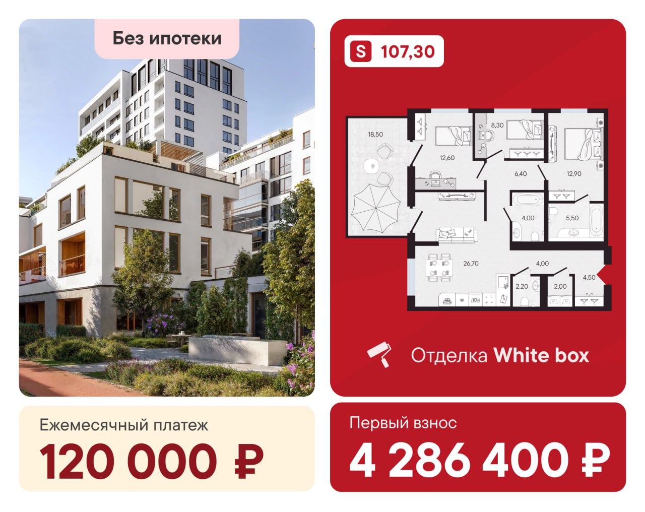 🔴 Рассрочка с первым взносом 10% — покупаете квартиру 107 м² напрямую от застройщика, не нужны банки и справки