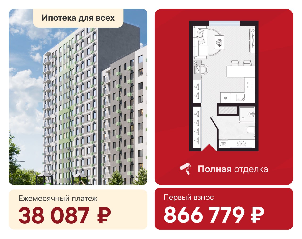 🔴 Первый взнос всего 866 779 ₽ — доступная сумма для первой квартиры, не нужно копить годами несколько миллионов, начинаете с реальных сбережений