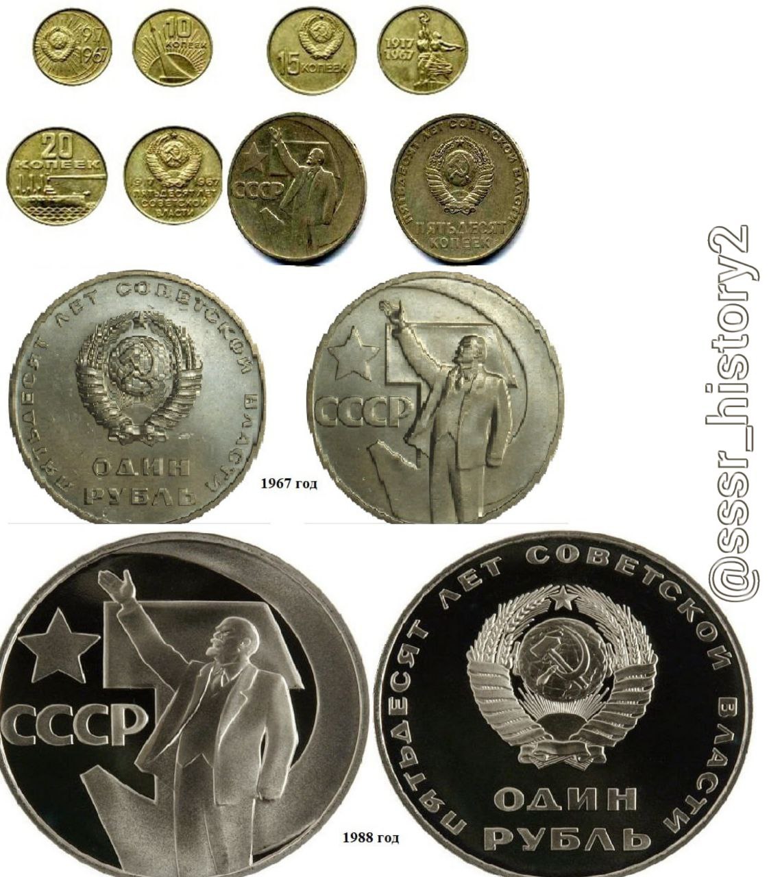 55 лет назад в 1967 году к юбилею Советской власти большими тиражами были выпущены памятные (с оригинальным дизайном) монеты достоинством от 10 копеек др 1 рубля.