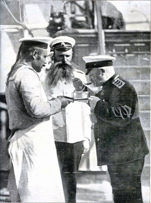 На фото: Адмирал Николай Оттович Эссен снимает пробу.
