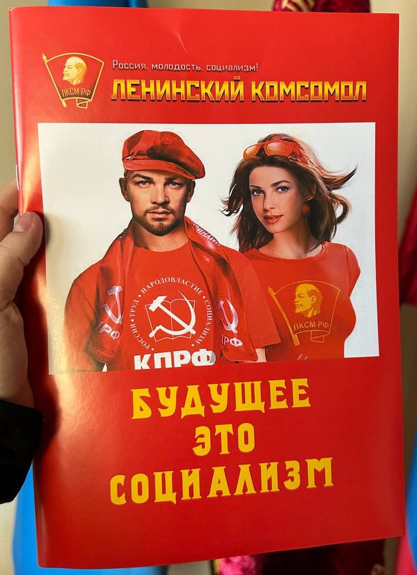 На стене портреты: вождя КПРФ Зюганова и губернатора Ульяновской области Русских. Портрет президента отсутствует. В углу – бархатный флаг цвета крови мирового пролетариата с изображением В.И. Ленина и серпа с молотом. На столе красуются экземпляр книги Г. Зюганова «Русский мир на двух осях» (воздержимся от ассоциаций) и суровый сувенир из Донбасса – опоясанная пулемётной лентой ручная граната Ф-1.