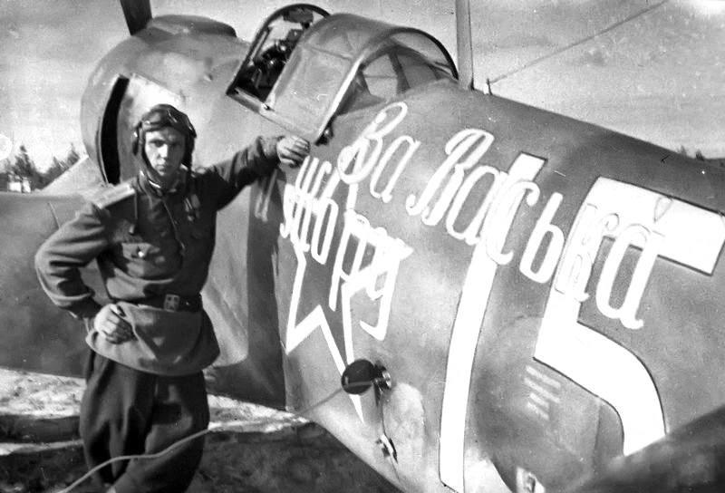 Лётчик 159-го истребительного авиационного полка 275-й истребительной авиационной дивизии 13-й воздушной армии Ленинградского фронта младший лейтенант Рузин Анатолий Васильевич (1923 г.р.), у своего истребителя Ла-5ФН с бортовым № 15 и надписью «За Васька и Жору».