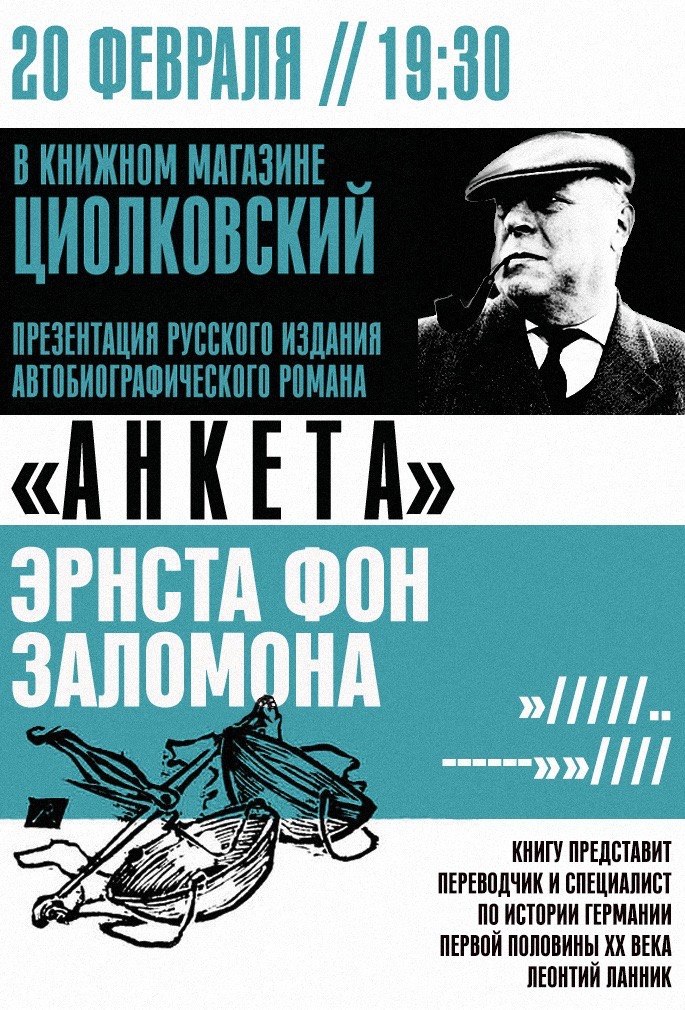 • В Москве состоится презентация русского издания автобиографического романа немецкого писателя, ландскнехта и политического авантюриста Эрнста фон Заломона «Анкета»