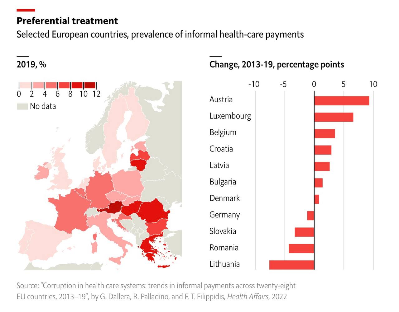 В своей работе Джулия Даллера (Giulia Dallera) и её коллеги использовали данные опросов, проведённых в 2013, 2017 и 2019 годах европейской организацией по изучению общественного мнения "Евробарометр". В каждом опросе приняли участие более 27 тысяч граждан из 28 европейских стран (Великобритания тогда ещё входила в ЕС). Участников спросили, приходилось ли им в последний год сталкиваться с просьбой внести неофициальную плату или же сделать ценный подарок медсёстрам, врачам или медучреждениям, чтобы им оказали помощь. В самом последнем опросе почти 4% европейцев заявили, что их просили внести неофициальную плату. Число таких пациентов увеличилось на 14% по сравнению с 2013 годом. При этом в обществе считается, что коррупция в здравоохранении становится более редким явлением.