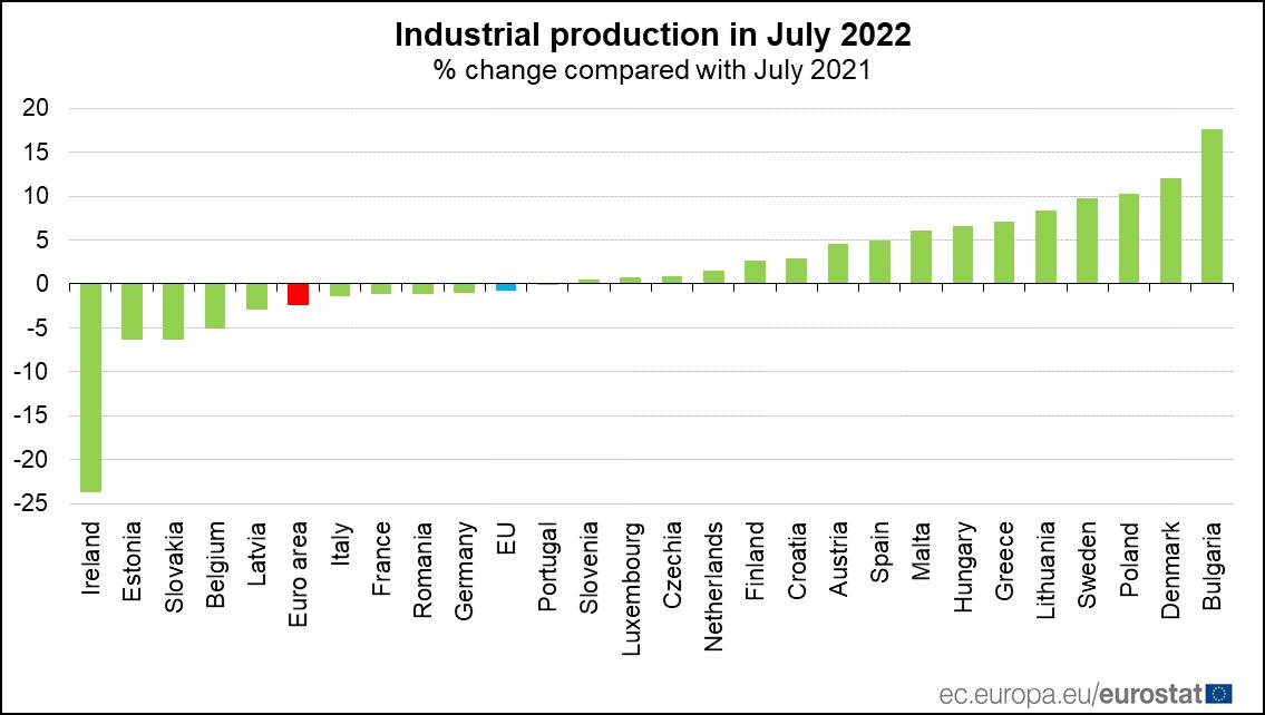 Согласно оценке Евростата, в июле 2022 года промышленное производство с учетом сезонных колебаний упало на 2,3% в еврозоне и на 1,6% в ЕС по сравнению с июнем 2022 года.