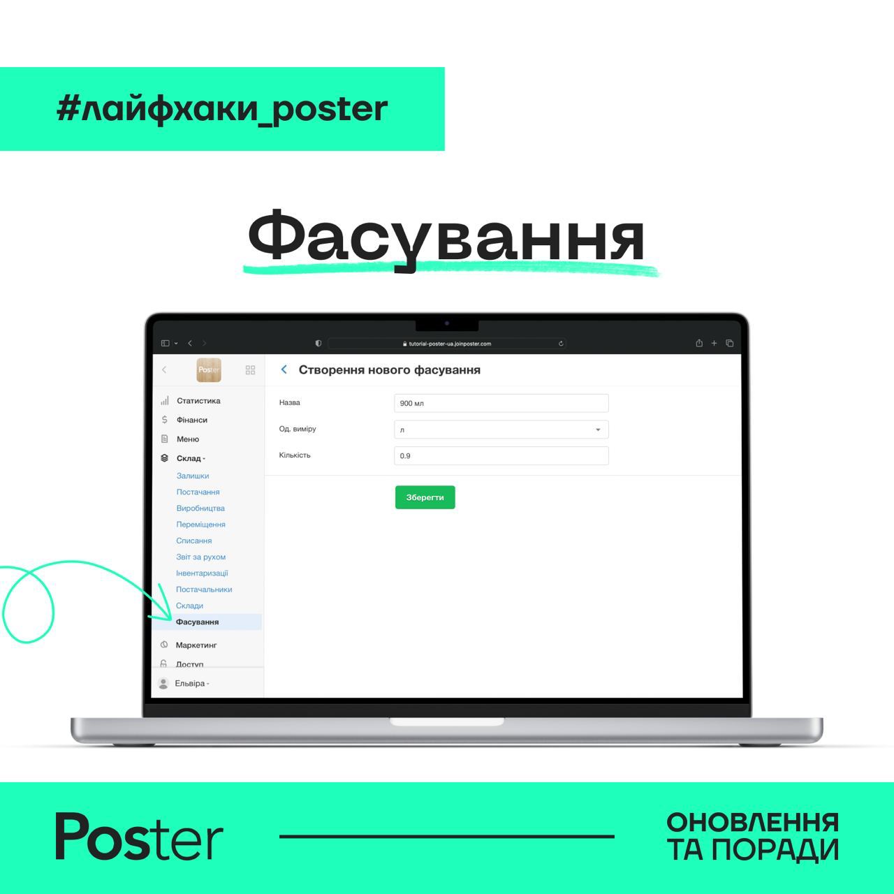 💡 Cтворіть фасування у вкладці Склад → Фасування. Ви можете створити будь-яку упаковку або кількість продукції. Наприклад, “900 мл” або “200 г”. Під час постачання молока обирайте фасування 900 мл замість літрів, а Poster сам порахує, скільки літрів ви отримали та собівартість одного літра.
