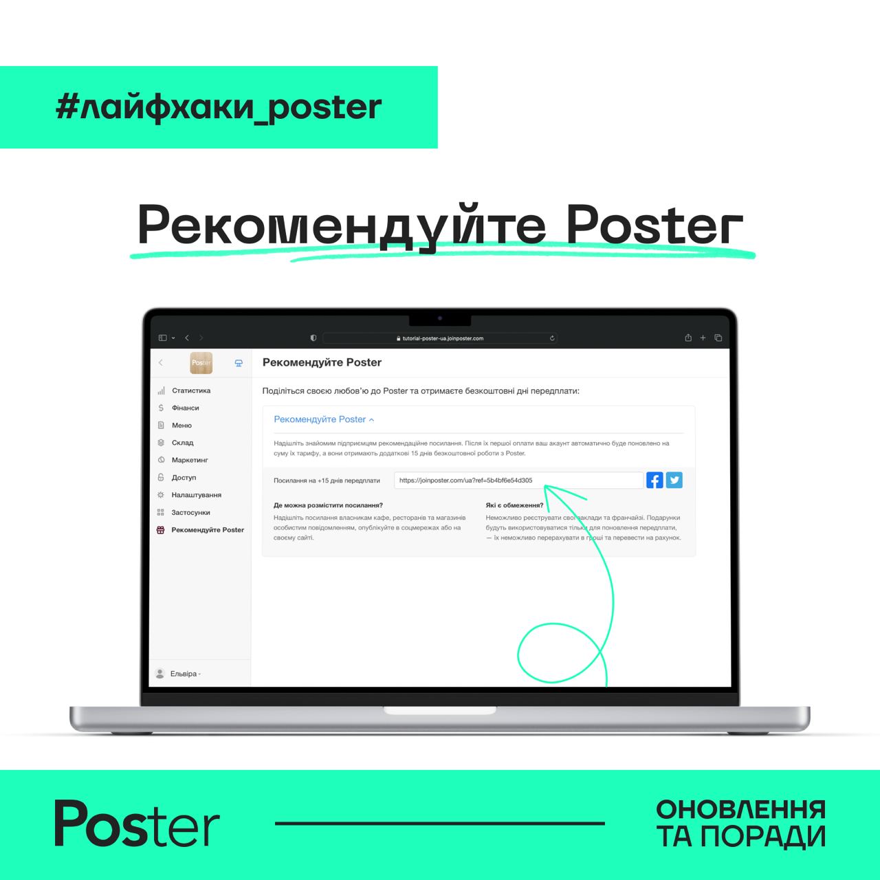 Порадьте вашим знайомим працювати з Poster та не забудьте відправити їм реферальне посилання для реєстрації. Так вони отримають додаткові 15 днів безплатної роботи з програмою, а ваш акаунт автоматично буде подовжено на суму їх тарифу.