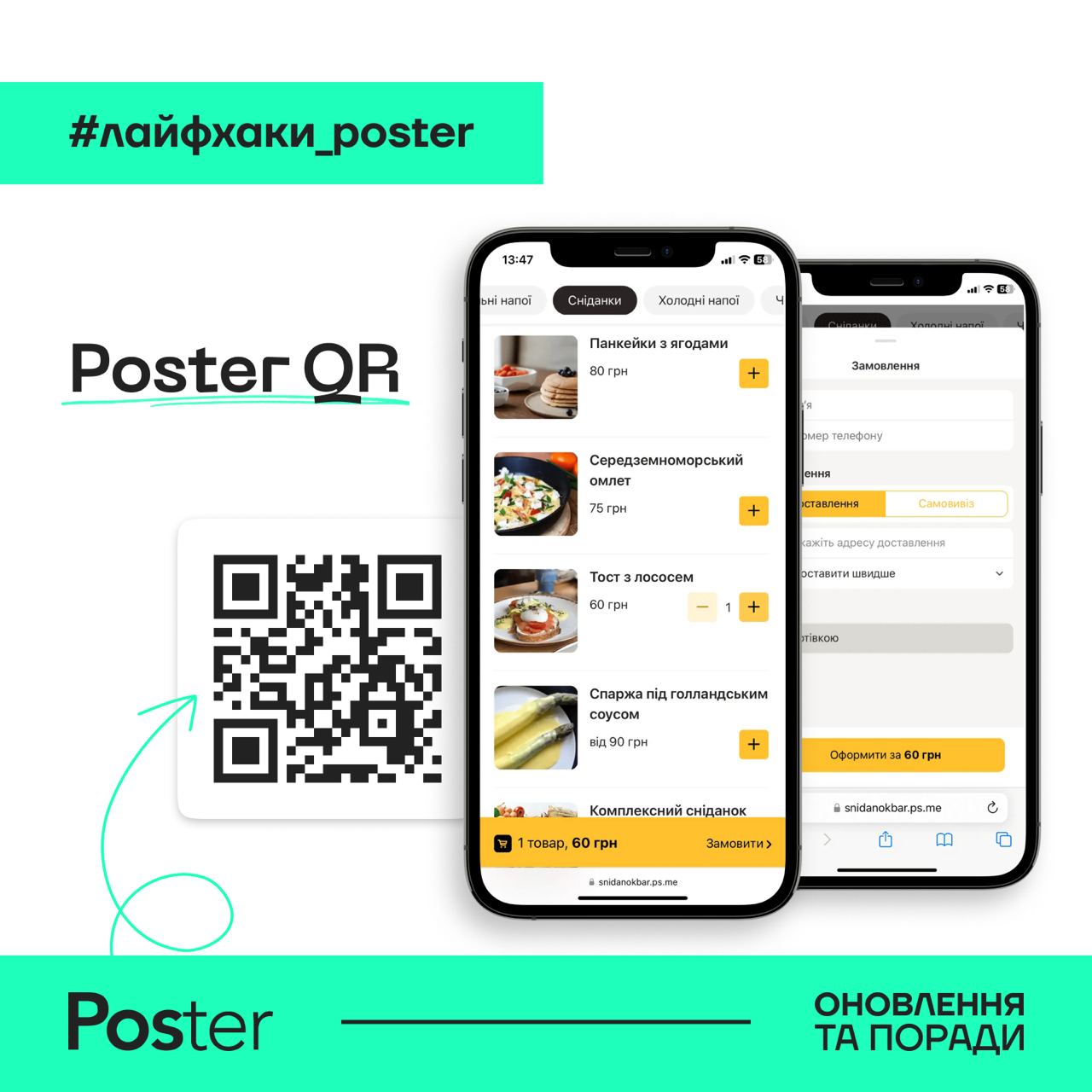 Створіть безконтактне меню або сайт для замовлень для вашого закладу із застосунком Poster QR. Після підʼєднання застосунку ви отримаєте сайт, який автоматично наповниться товарами та тех. картками з меню вашого аккаунту Poster.