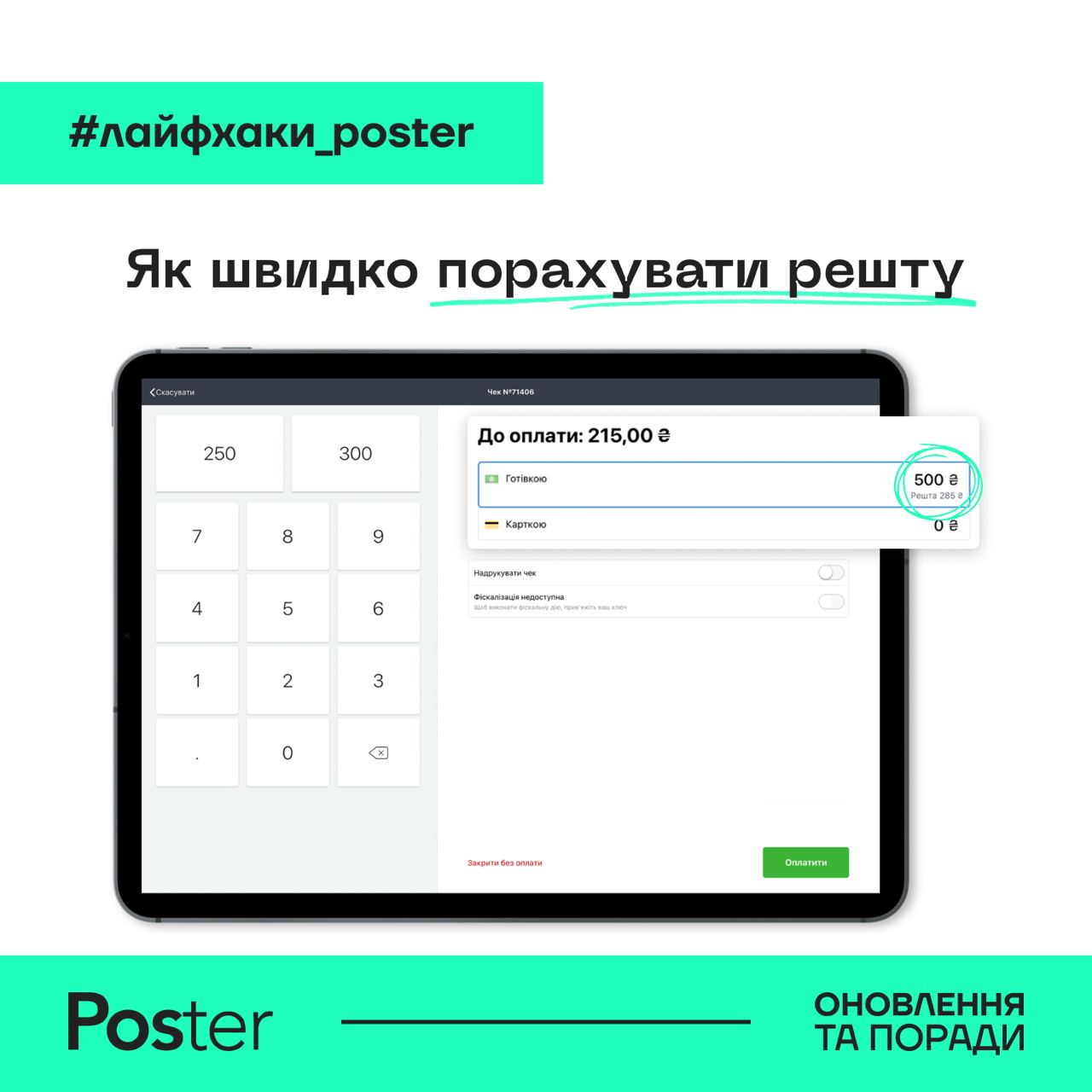 Для цього на екрані оплати у полі з готівковим методом оплати почніть вводити суму готівки, яку дав вам гість. Poster миттєво розрахує, яку решту вам треба видати.