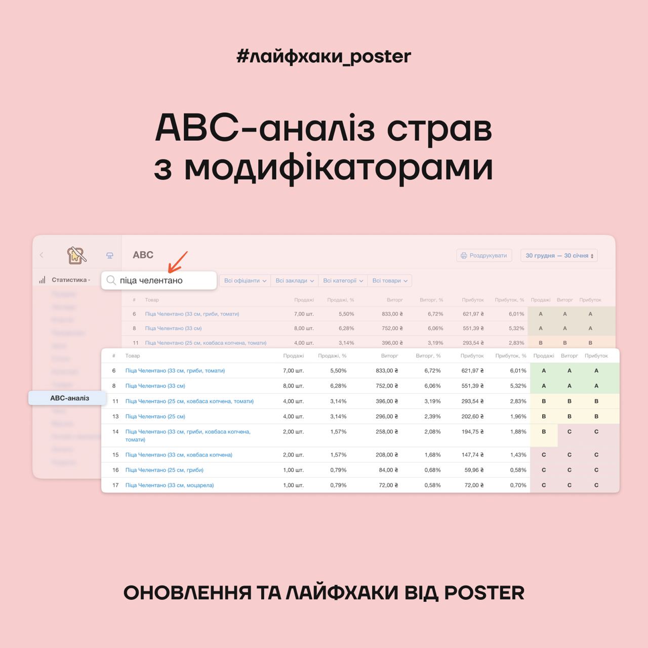💡 Зайдіть у вкладку Статистика → ABC-аналіз та в пошуку введіть назву страви, наприклад «піца Челентано». Подивіться, з якими додатками беруть піцу частіше та які додатки приносять більше прибутку. Також зможете легше вирішити, які додатки можна прибрати з меню, а на які слід підняти вартість.