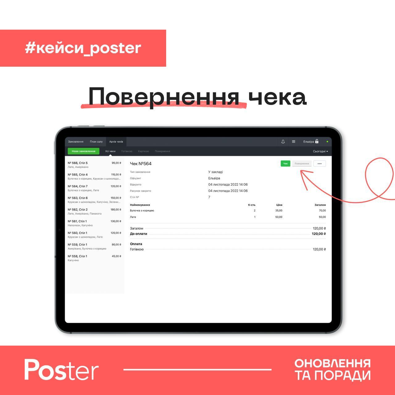 2. Ваш банківський термінал підʼєднаний до Poster і чек був сплачений карткою. Зробіть повернення, коли потрібно повернути гроші гостю.