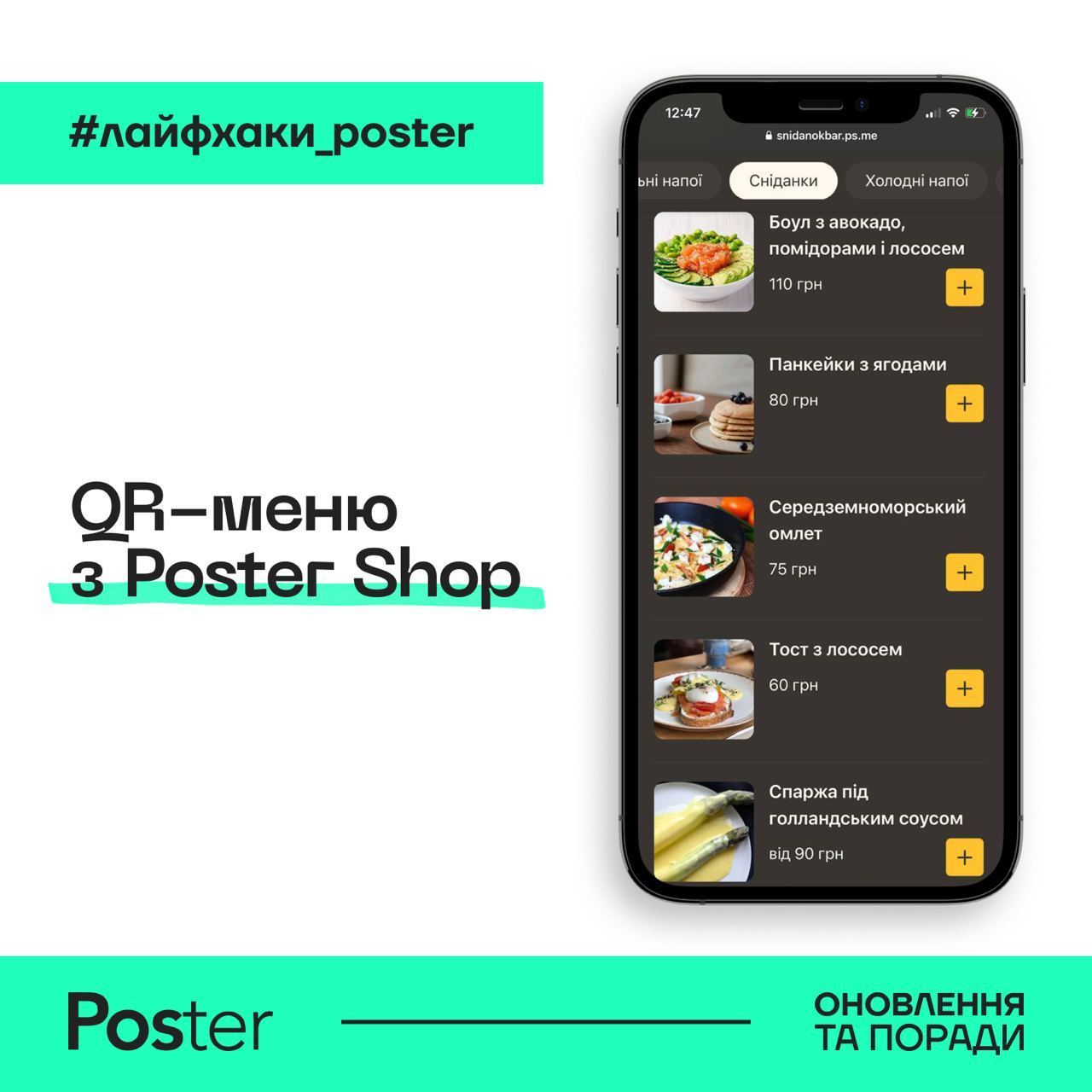 За допомогою Poster Shop можна створити сайт для замовлень з собою або на доставлення. А ще його можна використовувати для перегляду меню у закладі 😉