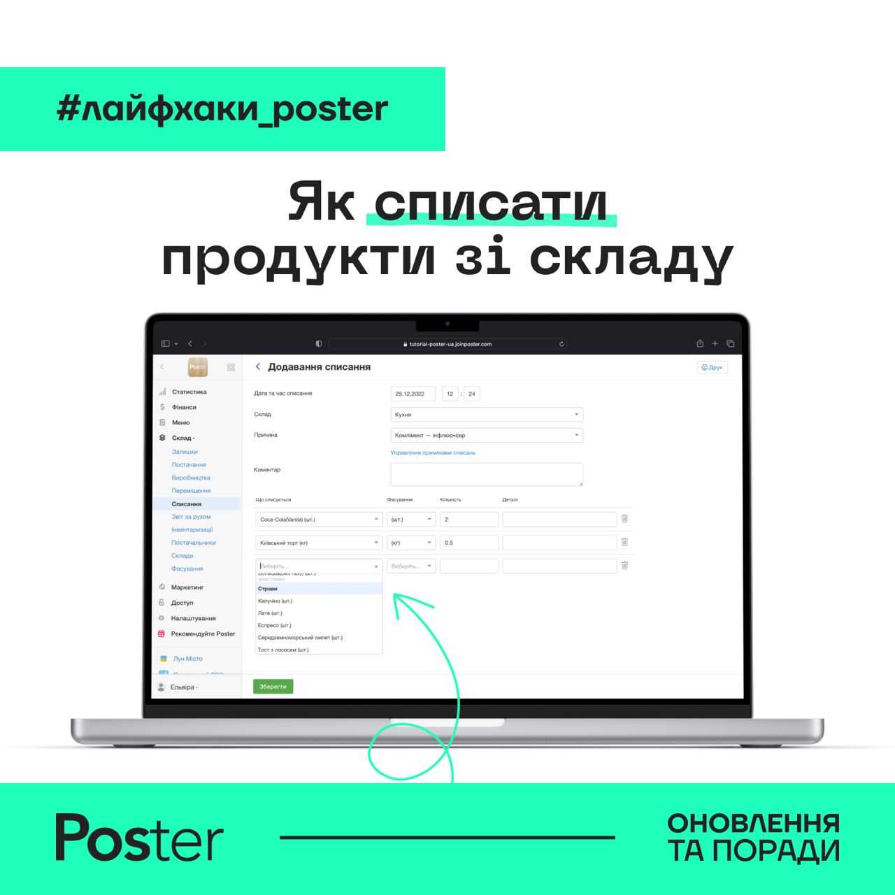 💡 Якщо вам потрібно списати продукти, зробіть ручне списання у вкладці Склад → Списання. Можете списувати окремі інгредієнти, або ж цілі тех. картки та напівфабрикати.