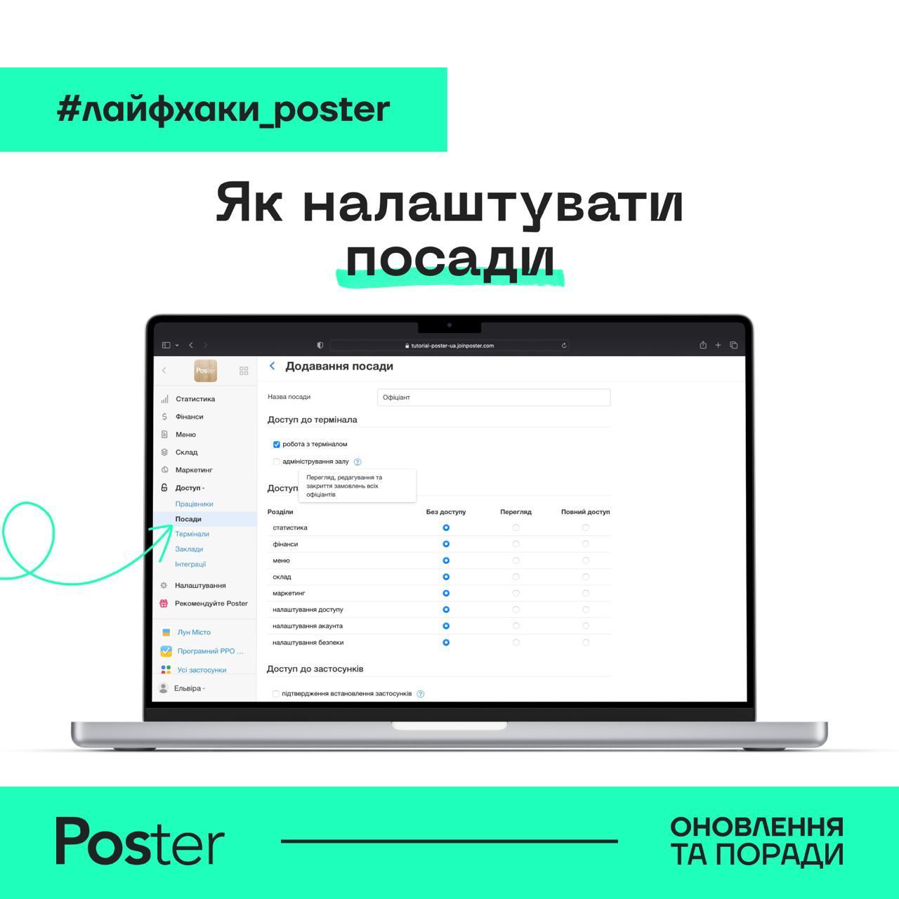 Створюйте та використовуйте посади для ваших працівників, щоб надати кожному різні права доступу до Poster, контролювати перегляд даних та обмежити дії в аккаунті.