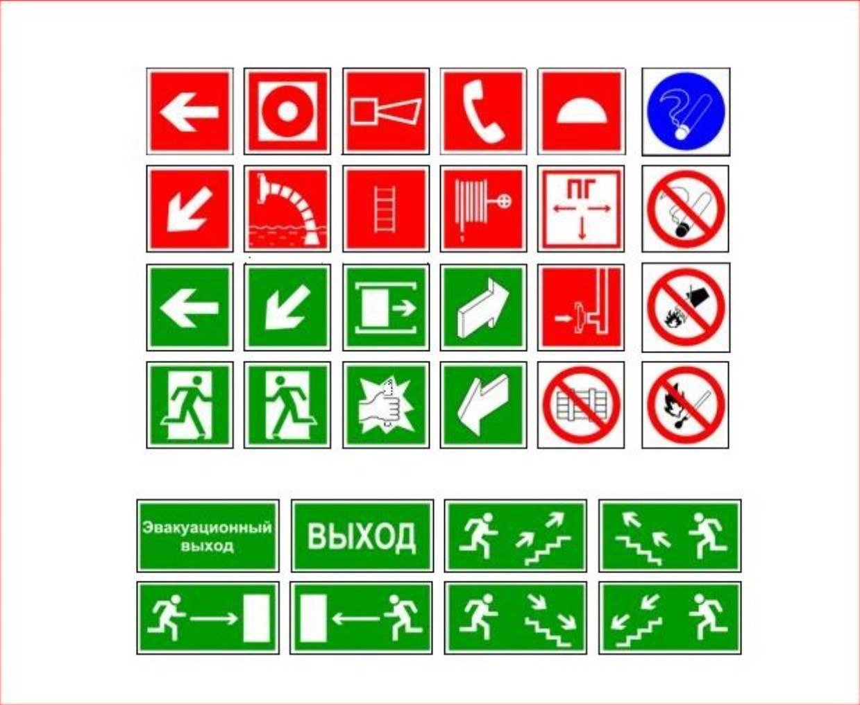 В каждом из рабочих помещений должны быть вывешены знаки пожарной безопасности, например, «Огнетушитель», чтобы обозначить его место нахождения, эвакуационный знак «Указатель выхода» — над дверью выхода и таблички с номером вызова пожарной охраны.