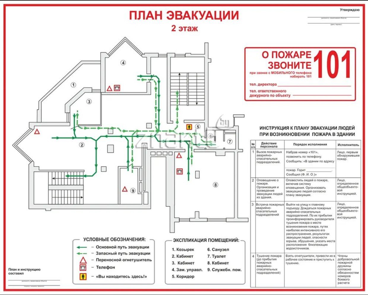 План эвакуации здания и людей утверждается руководителем предприятия. Должностные лица организации обязаны проинформировать и провести специальную подготовку сотрудников по технике пожарной безопасности перед размещением планов эвакуации. 📝